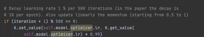 Learning rate는 epoch마다 1퍼센트씩 감소한다. 즉 이전의 learning rate의 0.99배가 된다.(local minima를 피하기 위해)