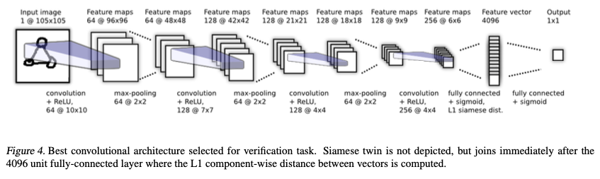 마지막 convolutional layer의 유닛들은 하나의 벡터로 flatten된다. 이 layer 뒤에는 fully-connected layer와 각 siamese twin간의 distance metric을 계산하기 위한 layer가 있다. (위의 코드로 더 이해가 쉬울 듯)
