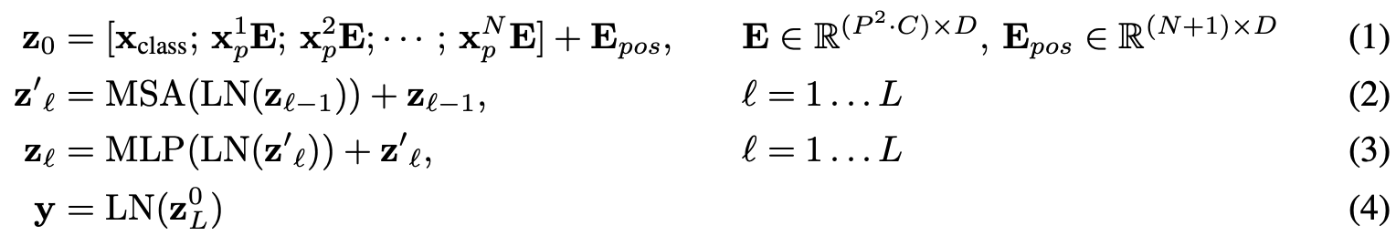 BERT의 [class] 토큰과 비슷하게, ViT의 저자들은 학습가능한 임베딩을 임베딩 된 패치들($\mathbf {z}_{0}^{0}=\mathbf {x}_{\text {class }}$)의 sequence에 추가하는데, 트랜스포머 encoder($\mathbf {z}_{L}^{0}$)의 output에서의 state가 image representation $y$로 역할을 하게 된다.