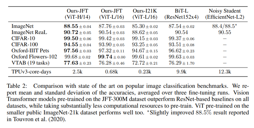 많은 양의 데이터에서 사전학습되고 여러 중간 사이즈나 작은 사이즈의 이미지 인식 데이터셋(ex. ImageNet, CIFAR-100)으로 전이 학습될 시에 Vision Transformer는 기존의 convolution기반의 SOTA 결과들에 비교해서 계산량은 적으면서 훌륭한 결과를 보여준다.