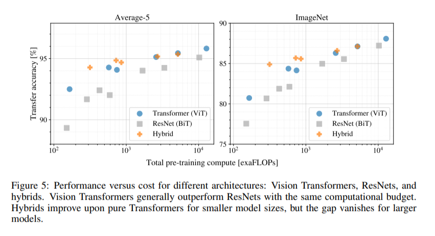 2. CNN의 feature map을 이용한 하이브리드 모델은 적은 computing cost에서는 ViT를 능가하지만 cost를 늘리게 되면 큰 차이가 없어진다는 것.