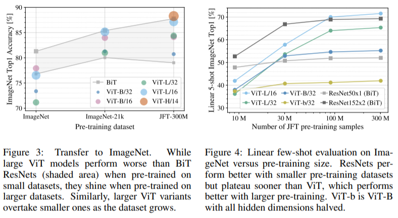 ImageNet과 같은 중간 사이즈의 데이터셋에서 학습했을 때, 모델은 ResNet보다 약간 낮은 수치의 정확도를 보여줬는데, 이는 트랜스포머가 CNN에 내재되어 있는 inductive biases(translation equivariance and locality)가 부족함을 의미한다. 이 때문에 중간 사이즈의 데이터셋은 이 모델을 학습시키기에 충분하지가 않음을 알 수 있다.