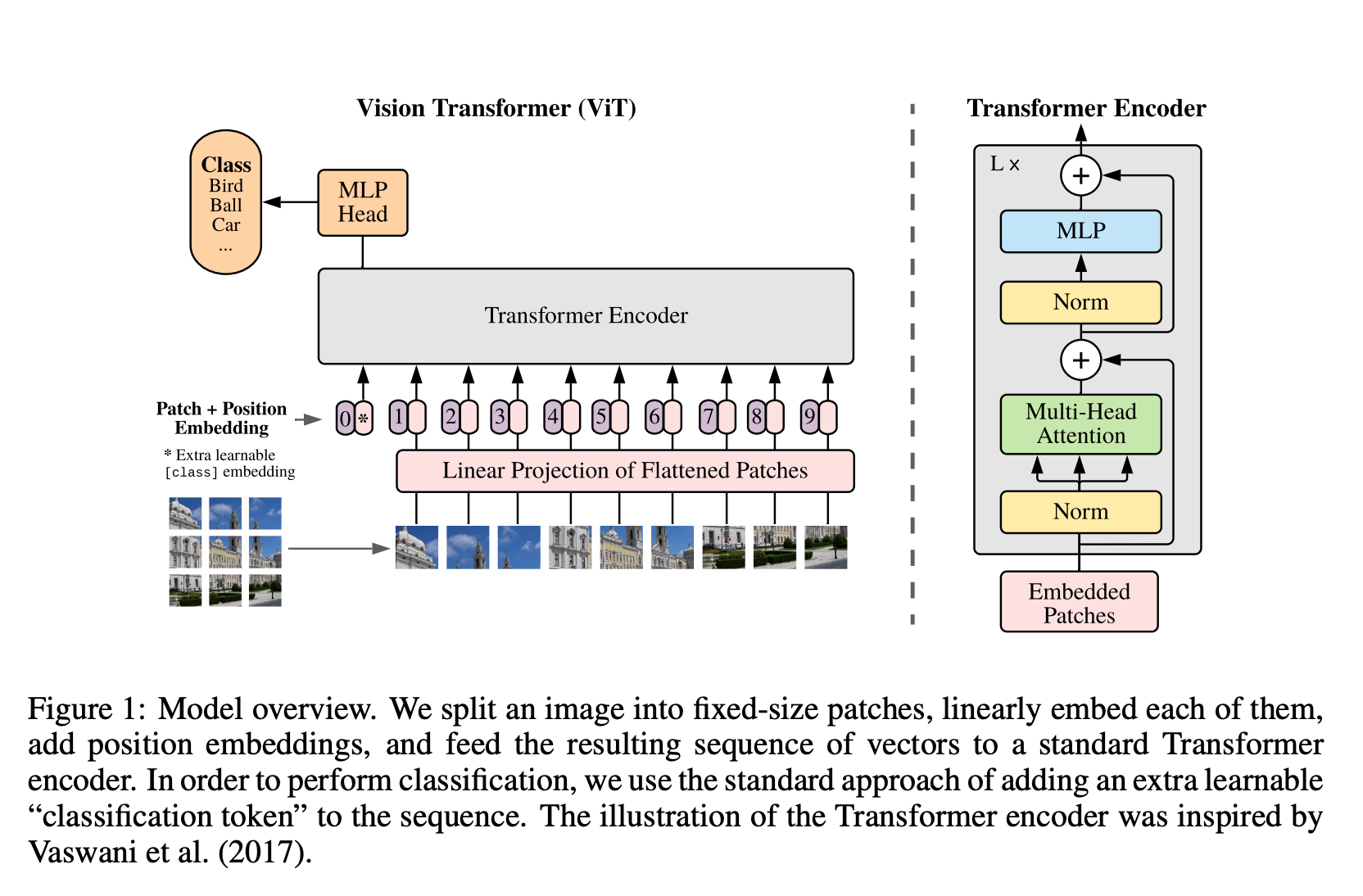 전체 모델의 구조는 위와 같은데, 이미지를 여러 패치들로 쪼개고 Linear projection 한 것과 위치 embedding(BERT에서도 position embedding을 사용했으니 여기서도 사용한 것 같다.)을 Transformer Encoder에 넣어준다.