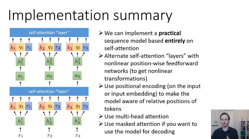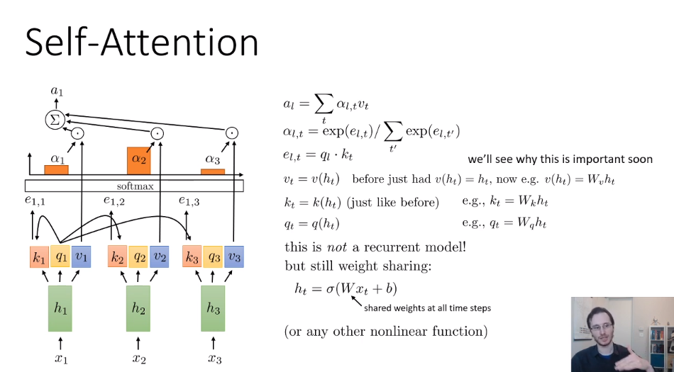 이렇게 나온 key, query, value를 이용하여 서로 dot product를 취한 후 softmax등의 함수를 취해 최종적으로 값을 구하게 된다. 이 값들을 weight로 value vector를 weighted sum하여 activation value $a_l$가 나오게 된다.
