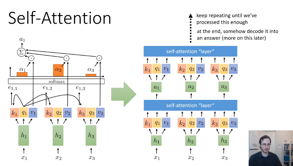 위의 복잡한 계산과정을 self-attention layer로 치환하게 되면 오른쪽과 같은 그림이 나온다.