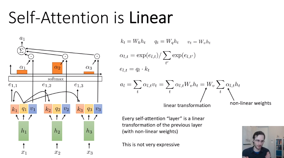 계산과정을 보면 Linear한 연산인 행렬곱, weighted sum등이기 때문이다. 매 self-attention layer는 이전 layer의 linear transformation(with non-linear weights)