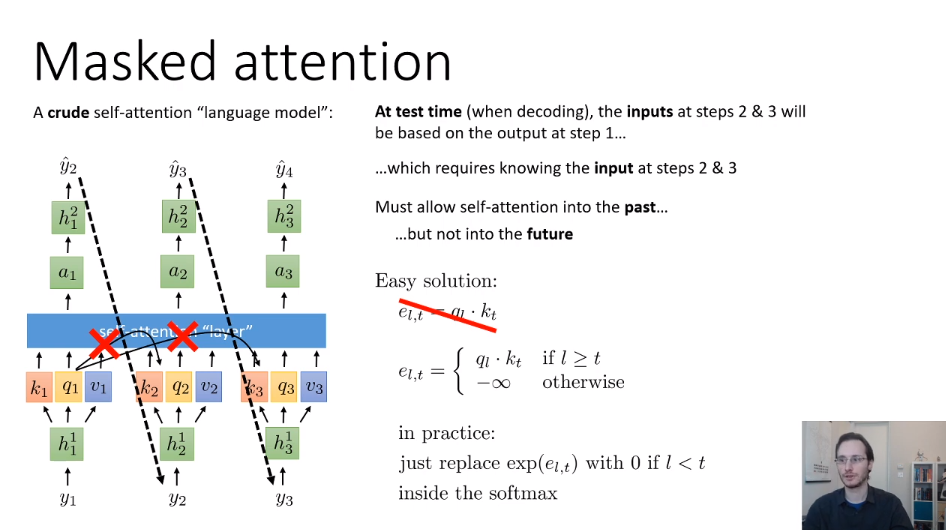 이를 위한 쉬운 방법으로는, key가 query보다 늦게오는 경우에는 dot product를 하지 않고 마이너스 무한대를 취한 것이다.(이를 softmax에 적용하면 0이 됨) + 실제 코드에서는 그냥 softmax때에 0으로 취하면 됨.