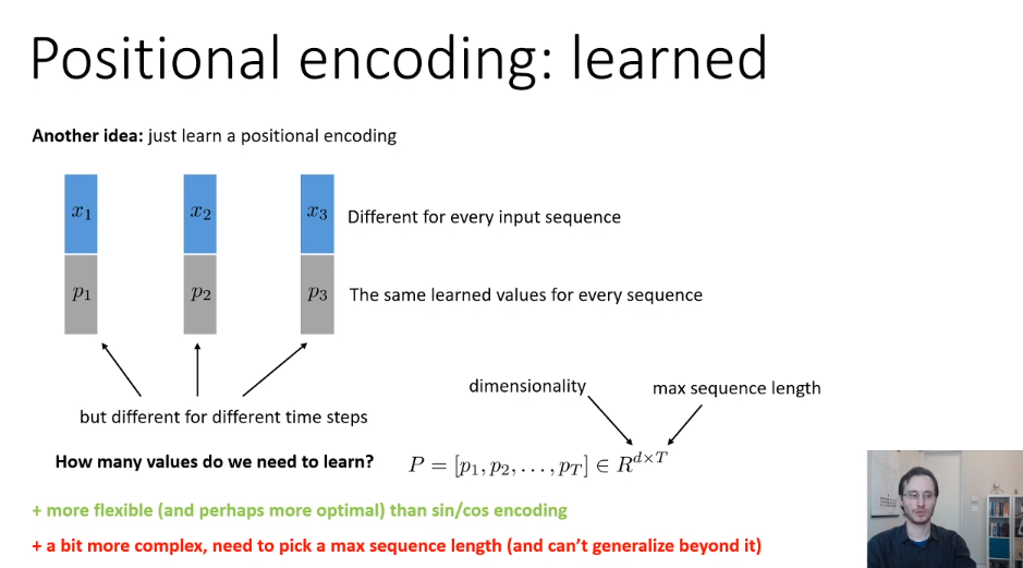 사실 위와 같이 position을 sin/cos에 넣어서 encoding하는 방법 외에도 학습하여 사용하는 방법이 있다.
