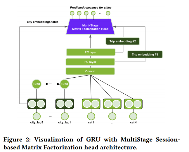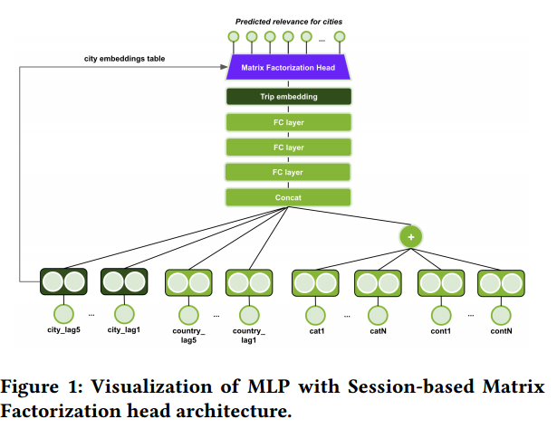 이러한 세 가지 구조사이에 공유되는 요소는 Session-based Matrix Factorization head인데, 아이템인 도시 임베딩과 세션인 여행 임베딩 사이의 linear mapping을 학습하는 것이다. 이러한 임베딩을 dot product함으로써 추천을 하게 된다.