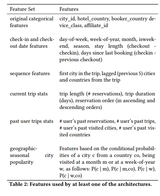 이전 방문 도시들에 대한 embedding tables은 공유된다. 모델은 categorical input features만 사용하는데 추가적으로는, trip length나 reservation order와 같은 numerical features을 임베딩시킨 것도 포함한다.