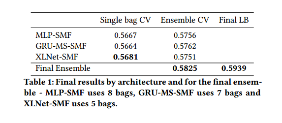 흥미로운 점은, MLP-SMF 구조는 CV score 측면에서 GRU나 XLNet을 사용했을 때 만큼의 성능을 보여줬다는 것이고 다른 모델들에 비해 모델 자체가 가볍기 때문에 학습하는 데에도 제일 시간이 적게 들었다.