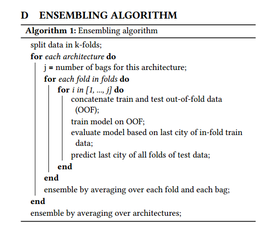 저자들은 k-fold cross-validation과 bagging(모델들을 여러개의 random seed에서 여러번 학습시키는 방법) 방식을 사용해서 위에서 설명한 세 개의 모델들을 앙상블했다.
