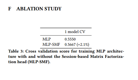 세 개의 모델 모두 Session-based MF head를 사용했으며 여행 순서를 뒤집음으로써 데이터 augmentation을 했다. 각 component가 얼마나 성능에 영향을 끼쳤는지를 보기 위해 다음의 ablation study도 진행했다.