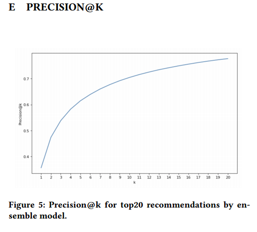 예측치를 평균내어 세 모델들을 앙상블하는 데에 더해서, 저자들은 또다른 앙상블 layer를 추가해보기도 했는데, 평균낸 예측치를 기준으로 나온 top 20개의 도시들을 rerank하는 방식이다. 결론적으로 precision@20에서 0.777의 평균 예측치를 보였고 이는 precision@4에서 0.57정도가 나온 값보다 훨씬 높은 수치이다.