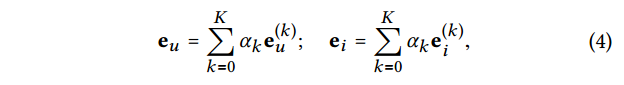 위의 식을 통해, A에 self-connection을 넣고 embedding을 propagating하는 것은 각 LGC layer에서 propagated된 embedding을 weighted sum하는 것과 같다.