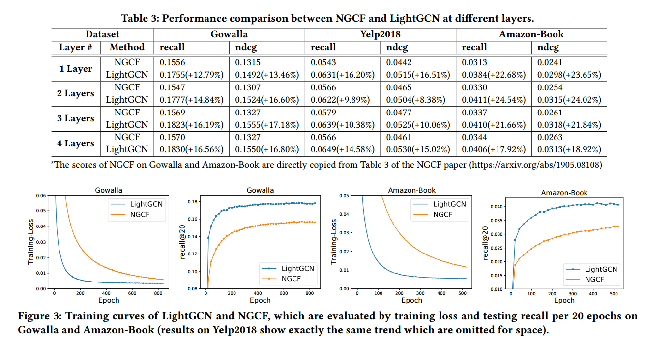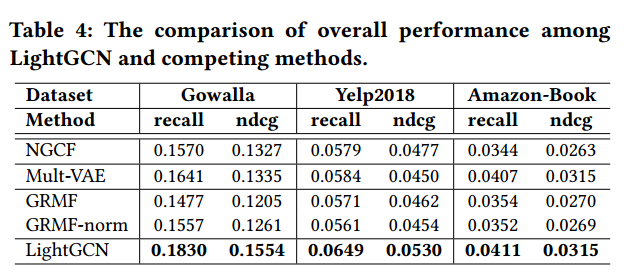 특히, Gowalla dataset에서 NGCF의 최고 recall은 0.1570이며 LightGCN은 0.1830이다.