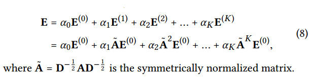 위의 식을 통해, A에 self-connection을 넣고 embedding을 propagating하는 것은 각 LGC layer에서 propagated된 embedding을 weighted sum하는 것과 같다.