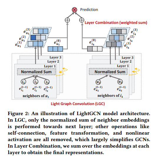 LGC에서는 connected neighbors만 aggregate하며 target node자체는 integrate하지 않는다. 이는 기존의 graph convolution형태와 다른데, 기존에는 extended neighbors를 aggregate하며 self-connection도 해야했기 때문이다.