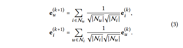 LightGCN에서는 간단한 weighted sum aggregator를 사용하고 feature transformation과 nonlinear activation을 사용하지 않는데, graph convolution operation(a.k.a. propagation rule)은 다음과 같다.