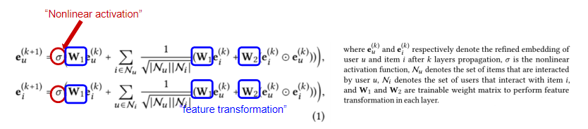 NGCF는 standard GCN을 따라 nonlinear activation과 feature transformation matrices W1, W2를 사용한다. 그러나 이 두 operation(nonlinear activation, feature transformation)은 CF에 유용하지 않다.