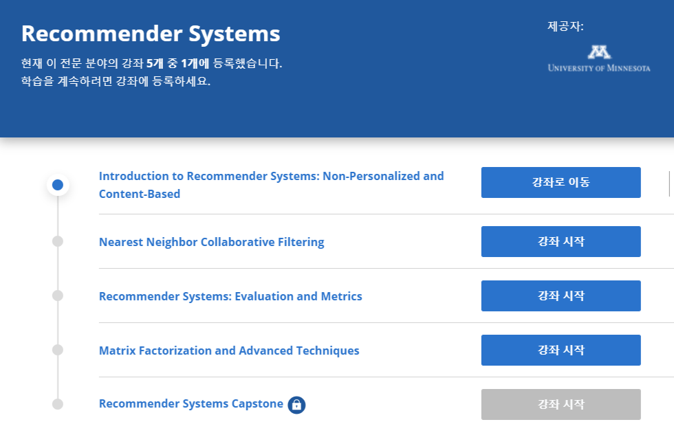 coursera의 추천시스템 Recommender system by MINNESOTA 강의를 마스터하려고 한다.