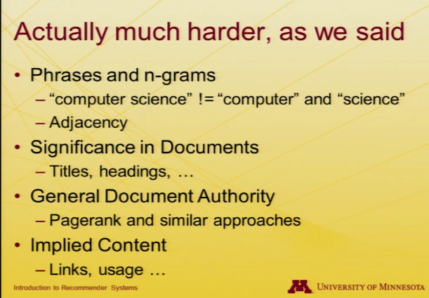 Content filtering은 말그대로 user의 선호도에 따라 profile을 만드는 것이다. 이 과정에서 TFIDF는 각 term이 얼마나 중요한 지에 대한 척도가 된다. 이를 통해 weighted vector를 얻을 수 있다. 이 vetor는 profile에 사용된다.