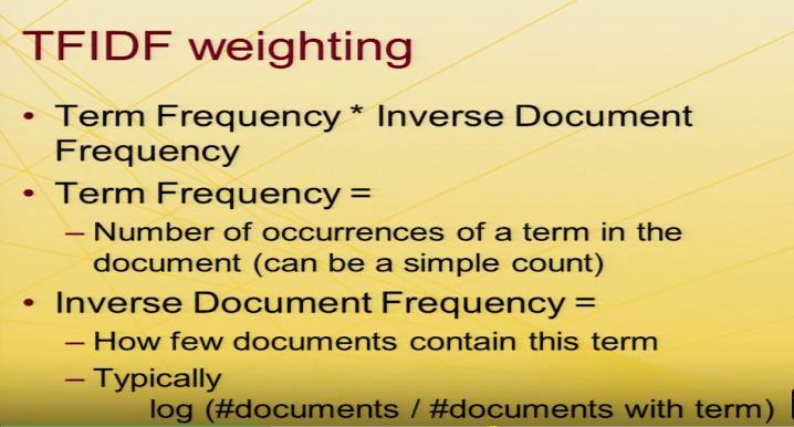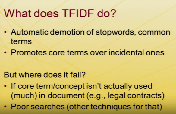 TFIDF를 통해 흔한 term를 강등시킬 수 있다. 즉 끌어내릴 수 있다. 또, 핵심 단어를 부수적인 단어보다 높게 평가할 수 있다.