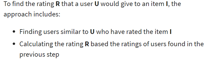 사용자 U가 아이템 I에 대해 한 평가 R을 찾는 방법은 : 1. 아이템 I에 대해 평가를 한 사용자 U와 비슷한 사용자들을 찾고, 2. 이 사용자들을 기반으로 평가 R을 계산하는 것이다.