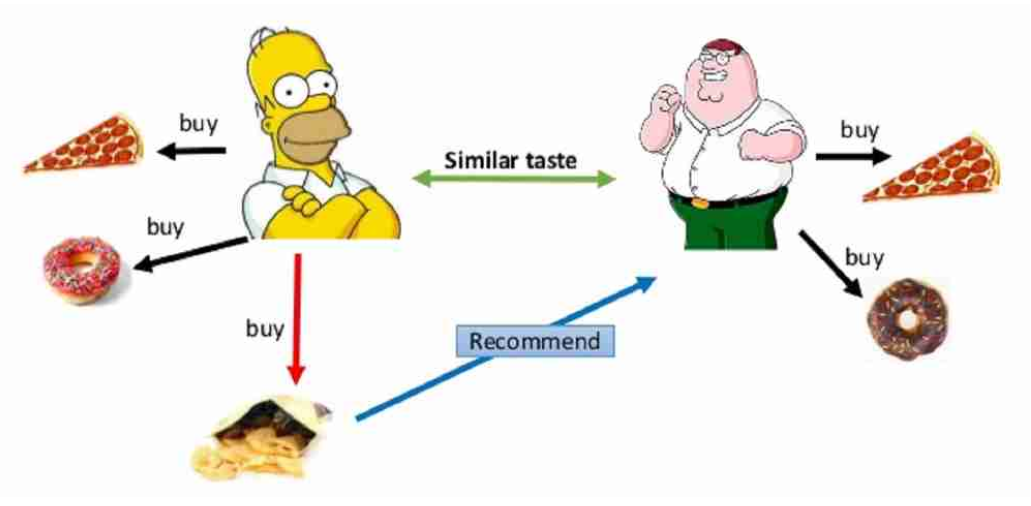 위의 그림에서도 알 수 있듯이 특정 사용자 A에게 컨텐츠(영화, 뉴스기사 등)를 추천하고자 할 때 취향이 비슷한 사용자의 취향에 기반해 추천을 하는 것이다. 즉 이제까지 비슷한 컨텐츠를 재생하거나 읽은 사용자라면 비슷한 취향이겠거니 하고 컨텐츠를 추천해주는 것이다.