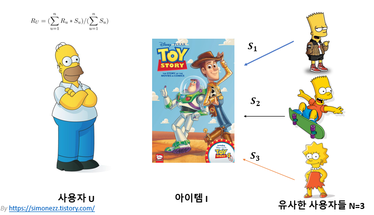 하지만 유사한 사용자들이더라도 사용자 U와의 유사도는 다를 것이다. 즉, 만약 10명의 유사한 사용자들을 골랐더라도 top 3명은 매우 유사하고 나머지는 별로 유사하지 않을 수도 있다.
