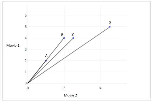원점과 각각 점들을 연결해보니 각도상으로 C는 사용자 A와 더 유사성을 보이는 것을 알 수 있다.