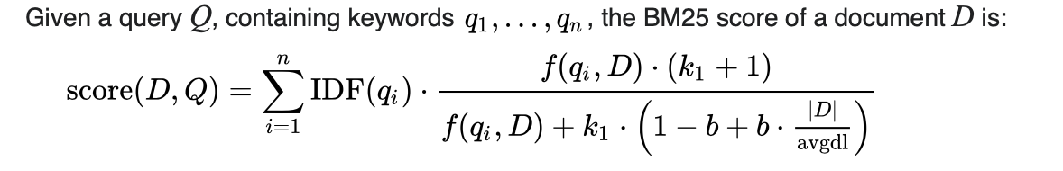 k1, b는 free parameters를 뜻한다. 주로 k1는 [1.2, 2.0]에 있고 b는 0.75로 선택된다.
