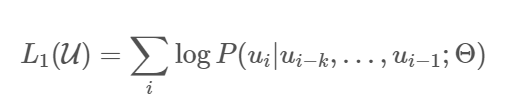 는 context window이고 조건부확률 는 parameter가 인 신경망을 사용하도록 설계되었다. 이 function은 SGD를 이용하여 최소화된다.