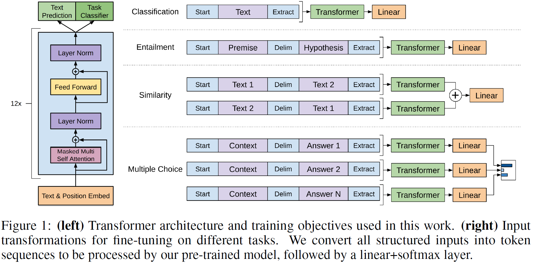 이 논문에서는 다양한 라벨링되지 않은 데이터로 pre-training을 시킨 후 특정 task에 맞춘 fine-tuning 과정을 거치는 단계를 가진다. 이전의 방법론들과는 달리 모델구조를 최소한으로 변화시키고 효과적인 Transfer를 얻기 위한 fine-tuning 단계에서 과제에 맞는 Input representations을 사용하였다. 다양한 실험 결과를 통해 이 접근이 다양한 과제에 대해 효과적임을 증명하였다.