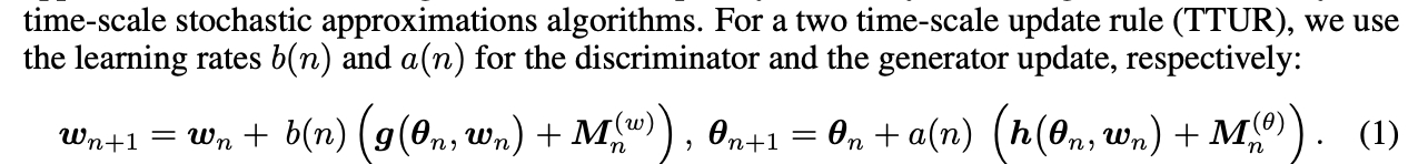 <TTUR>: 간단하게만 말하자면 learning rate를 generator와 discriminator에 각각 다르게 적용하는 것이다. 각자의 learning rate는 n에 대한 함수로 표현된다.