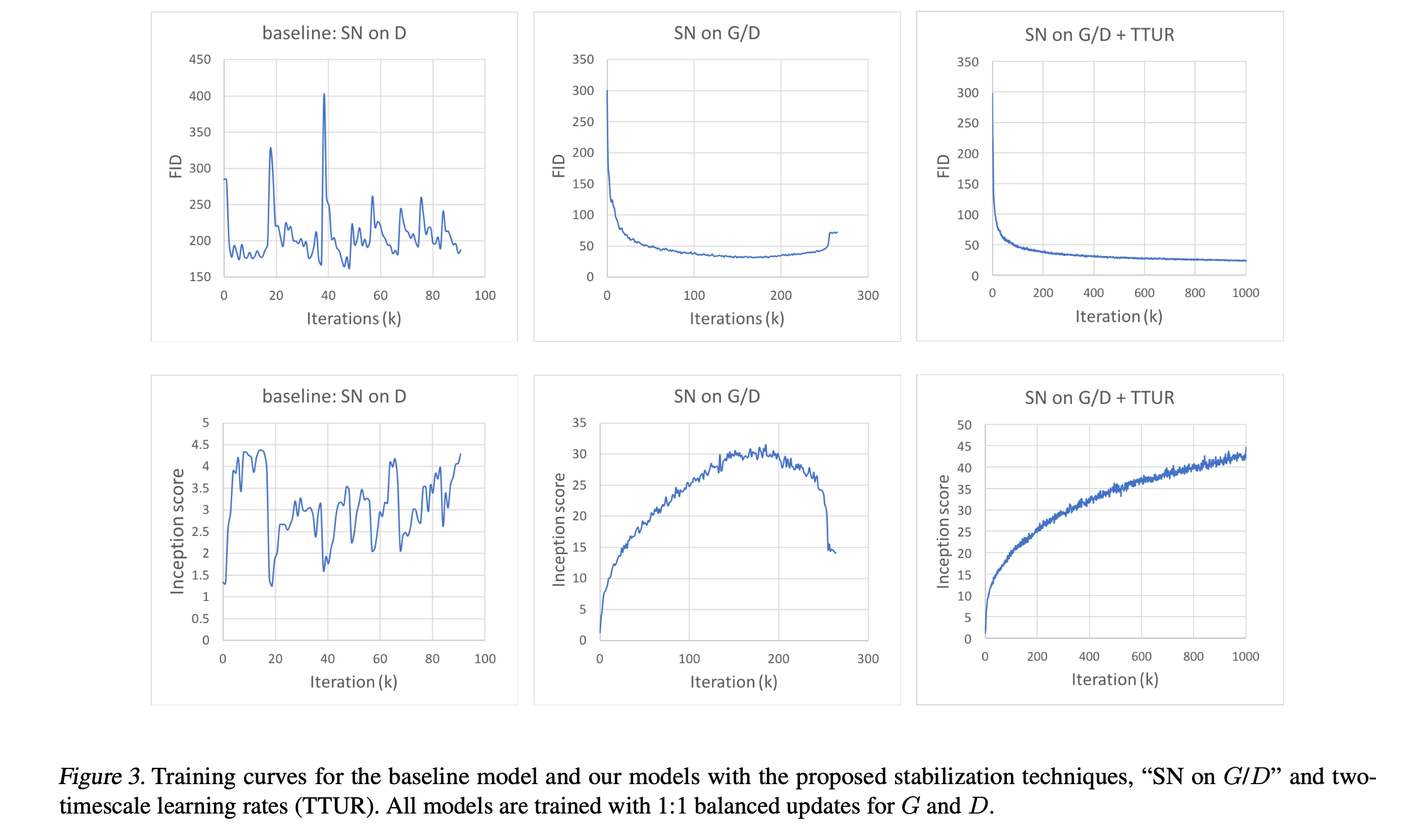 첫번째로는 GAN의 학습을 안정화하기위한 두 개의 제안된 방법(Spectral Normalization, TTUR)의 효과를 평가한다.