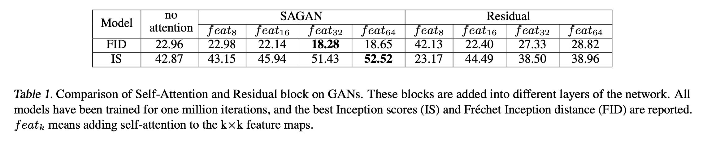 GAN에 self-attention과 Residual block을 각각 적용한 결과의 지표는 다음과 같다. 두 지표에서 모두 SAGAN이 우수함을 확인할 수 있다.