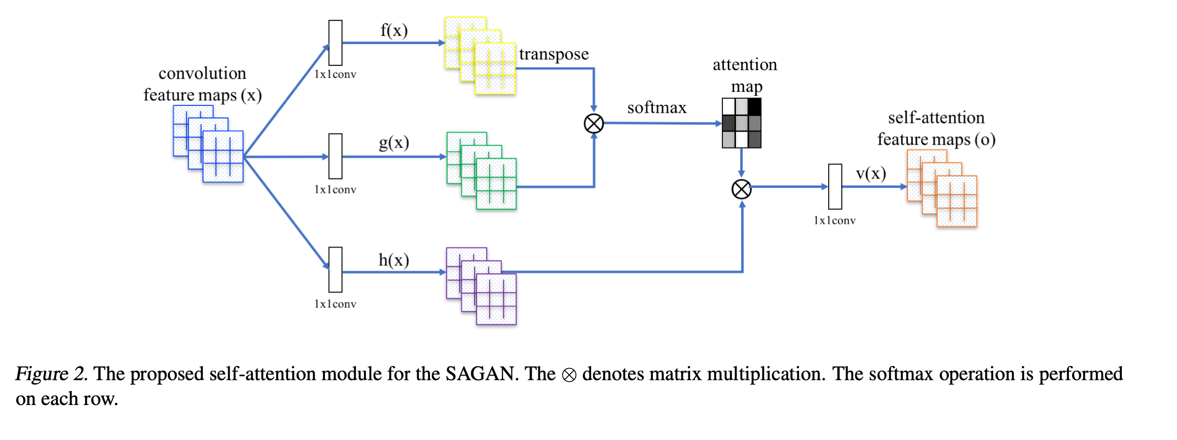 위의 형태에서, $ \boldsymbol{W}_{\boldsymbol{g}} \in \mathbb{R}^{\bar{C} \times C}, \boldsymbol{W}_{\boldsymbol{f}} \in \mathbb{R}^{\bar{C} \times C}, \boldsymbol{W}_{\boldsymbol{h}} \in \mathbb{R}^{\bar{C} \times C}, \text { and } \boldsymbol{W}_{\boldsymbol{v}} \in \mathbb{R}^{C \times \bar{C}} $ 은 학습된 weight 행렬들이다. 이 행렬들은 1X1 convolution을 거쳤다.