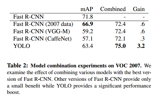 기본 YOLO모델은 다른 SOTA 시스템보다 특정 카테고리에서 낮게 나왔음을 확인할 수 있다. 이는 이전에 언급한 YOLO의 한계점 때문인데, 이와달리 YOLO를 Fast R-CNN와 합친 버전은 우수한 성능을 보여주었다.
