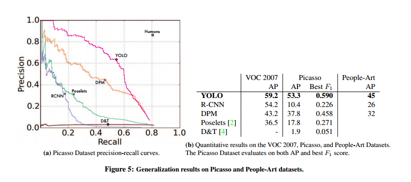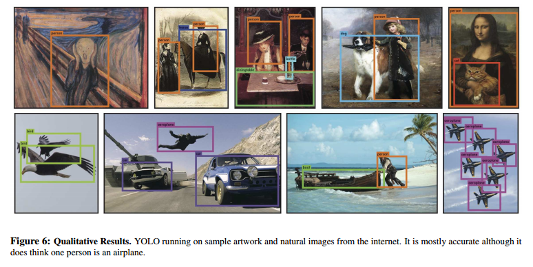 일반 이미지에서 학습되고 예술작품 등 다른 도메인의 이미지에서 테스트될 때, YOLO는 DPM과 R-CNN보다 월등히 성능이 좋다.