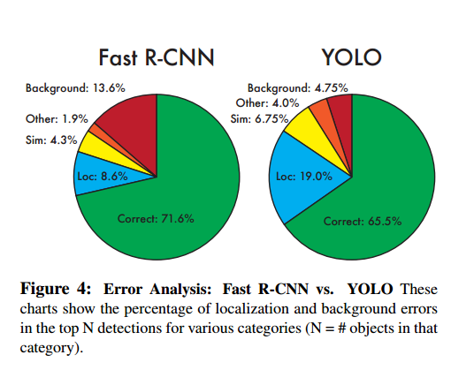 빨간부분의 background부분에서 YOLO가 더 error가 적음을 보여준다.