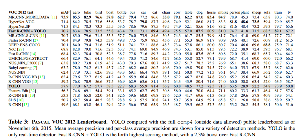 2) 또한 VOC 2012에 대한 결과도 보여주었으며 당시 SOTA 시스템과 mAP를 통해 비교하였다.