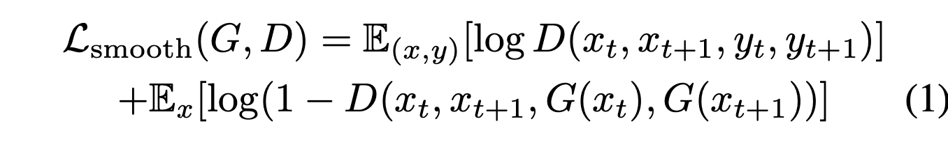 따라서 $D$는 real sequence $(x_{t-1}, x_t, y_{t-1}, y_t)$과 fake sequence $(x_{t-1}, x_t,G(x_{t-1}), G(x_t))$ 의 차이를 계산하여 판단하게 된다.