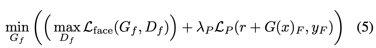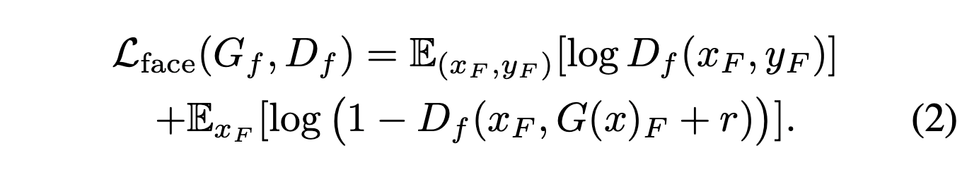 $G_f$를 거치게 되면 residual $r = G_f(x_F, G(x)_F)$가 나오게 되는데 이를 $G(x)_F$와 더하여 최종적으로 합성된 얼굴이 나오게 된다. 이런 합성 이미지를 마찬가지로 discriminator $D_f$가 진짜와 구별을 하며 학습을 하게 된다.
