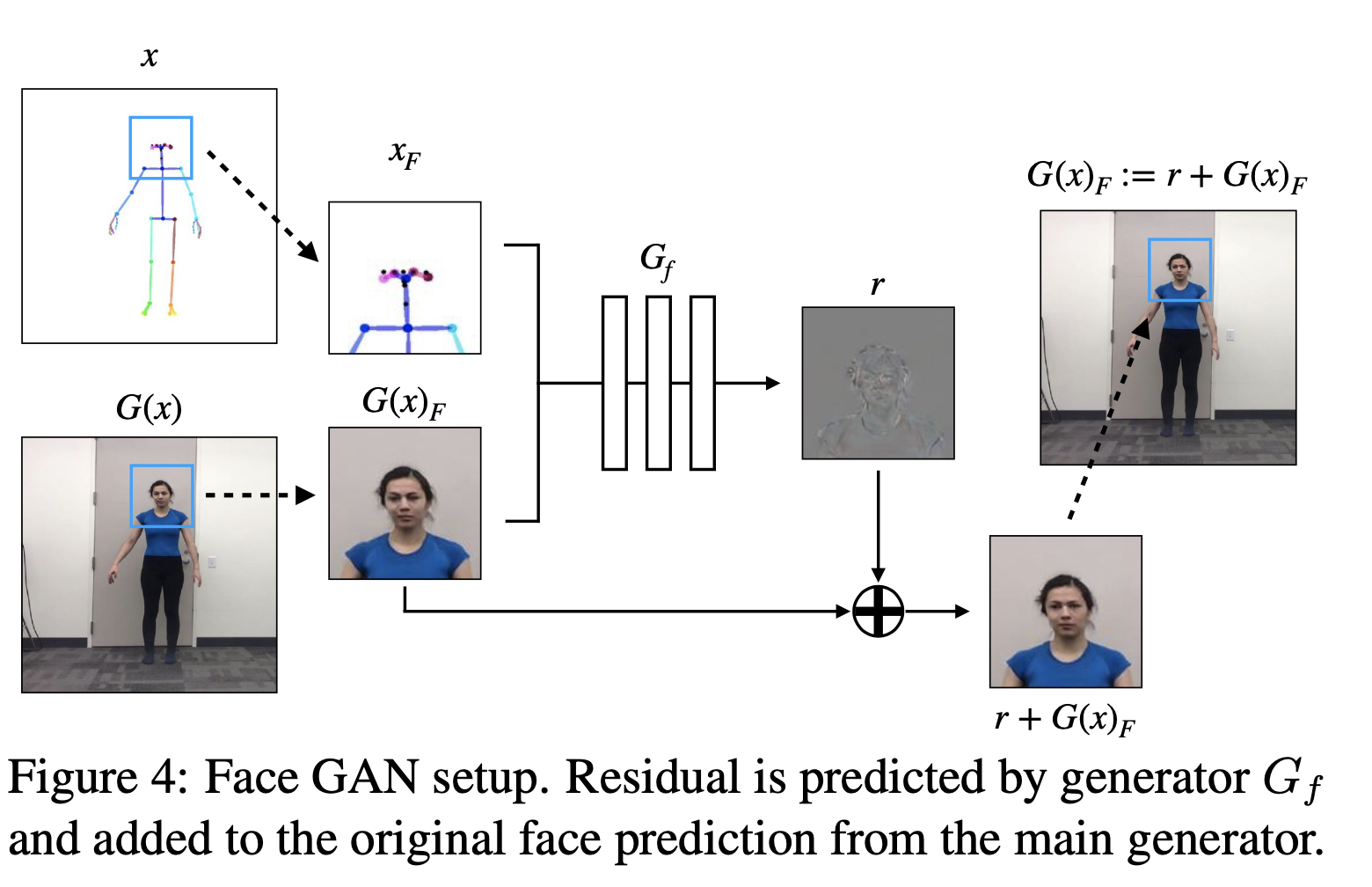 Generator $G$로 이미지를 만들어낸 후 이미지의 작은 부분 $G(x)_F$을 넣고 같은 방법으로 pose stick figure $x_F$를 또 다른 generator $G_f$에 넣는다.(위의 그림을 보면 좀 더 이해가 쉬움)